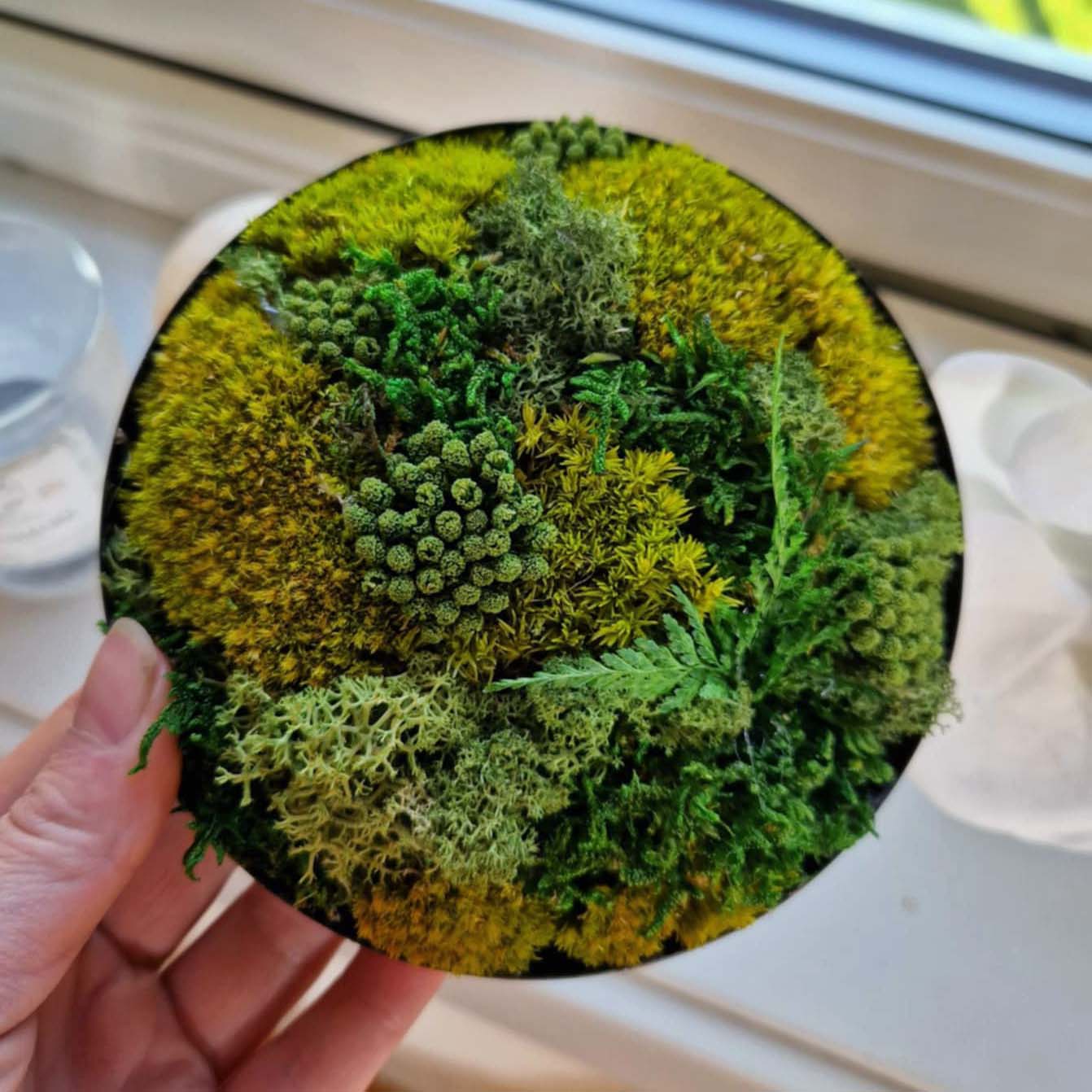 Unngå sollys, vann og luftfuktighet over 80 % for å bevare mosebildets kvalitet og skjønnhet i mange år.